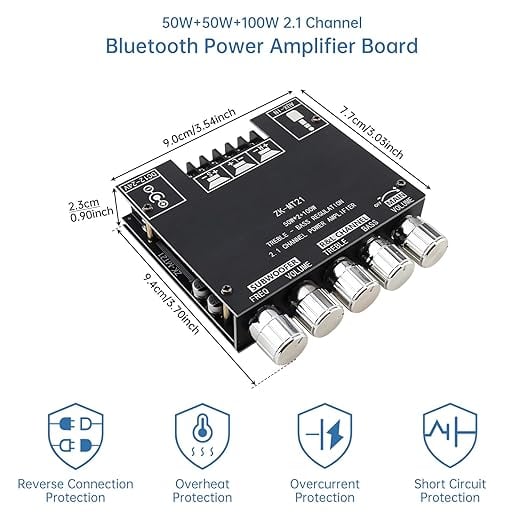 - Bluetooth audio amplifier module 2.1 channel, Max output power 2X50W+100W. The signal is better, the efficiency is high, and the anti-interference ability is strong